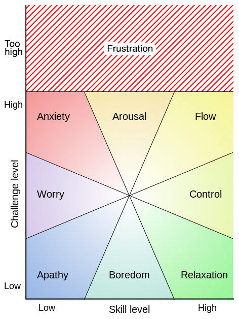 Lower the challenge and work on something easier. Simplify. There isn’t an exact science to this as you’ll have to experiment and see what works for you in a particular situation but if you look back to Csikszentmihalyi’s flow model, you’ll see that you don’t want to make the challenge too easy.