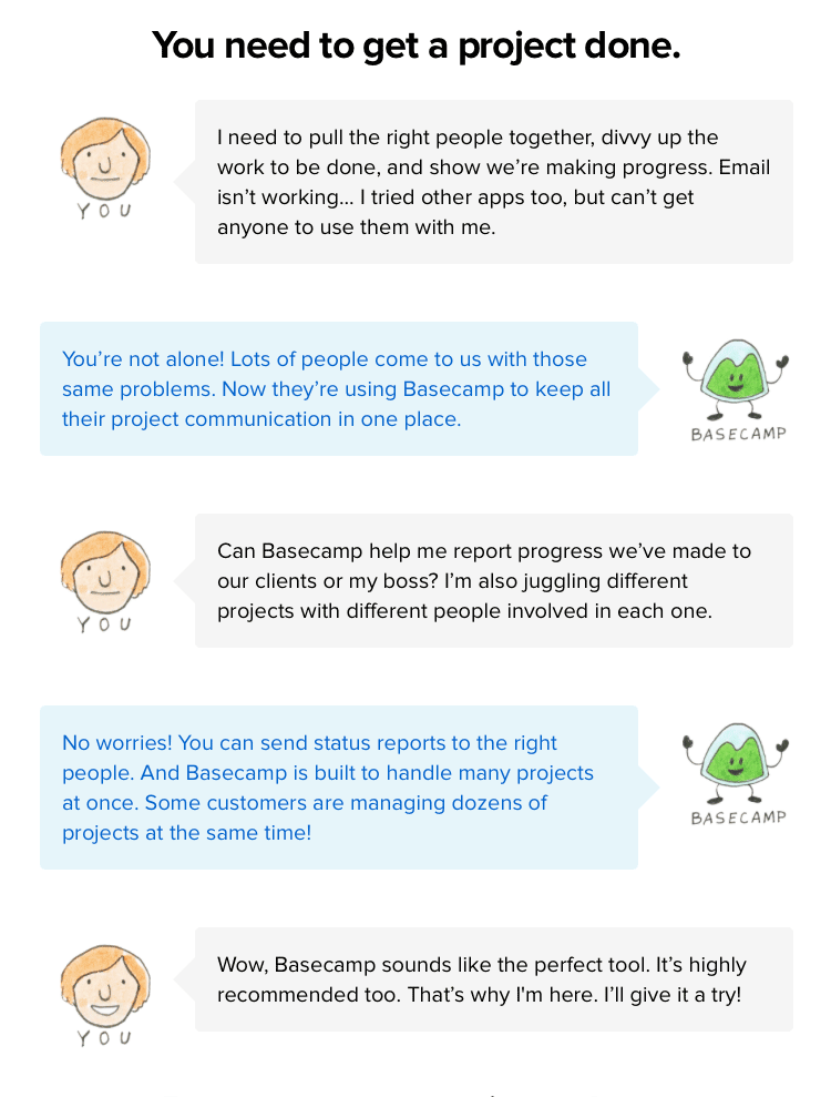 Next up is a mock conversation happening between “you” and Basecamp. This friendly conversation style acts as an introduction to Basecamp’s warm and friendly manner.