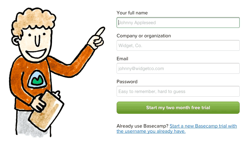 Throughout the site, Basecamp pitch themselves as a friendly, helpful company. Just look at the mascot on the homepage and the friendly guy helping you on the form on the sign-up page. Both are great examples of emphasising Basecamp’s willingness to help and be there for their customers.