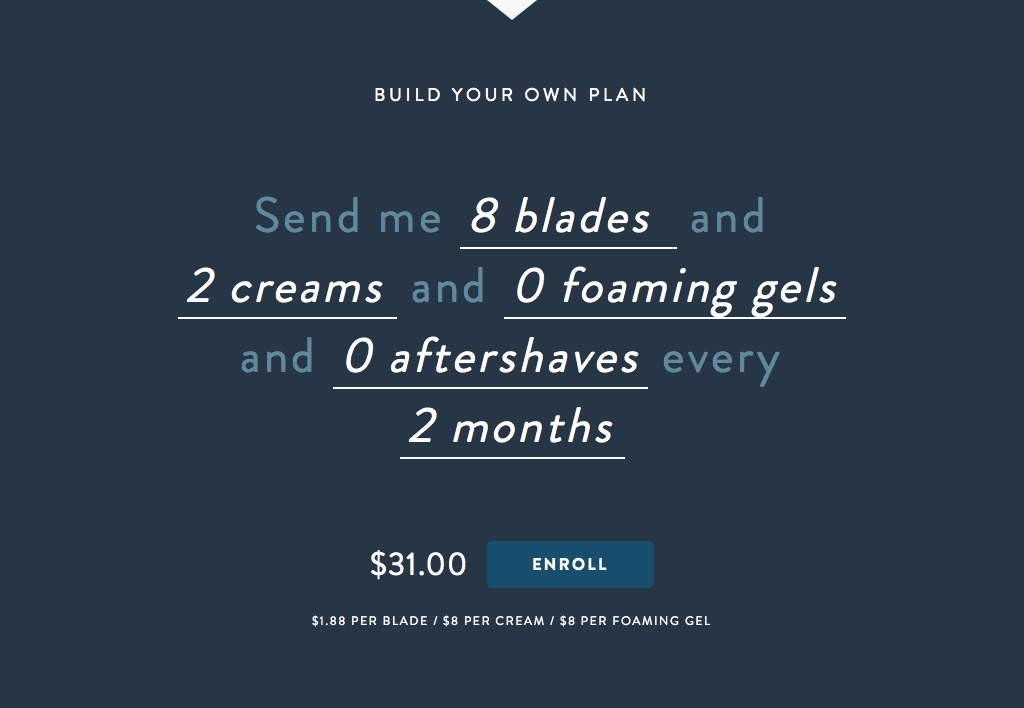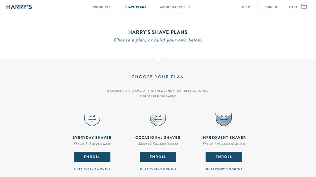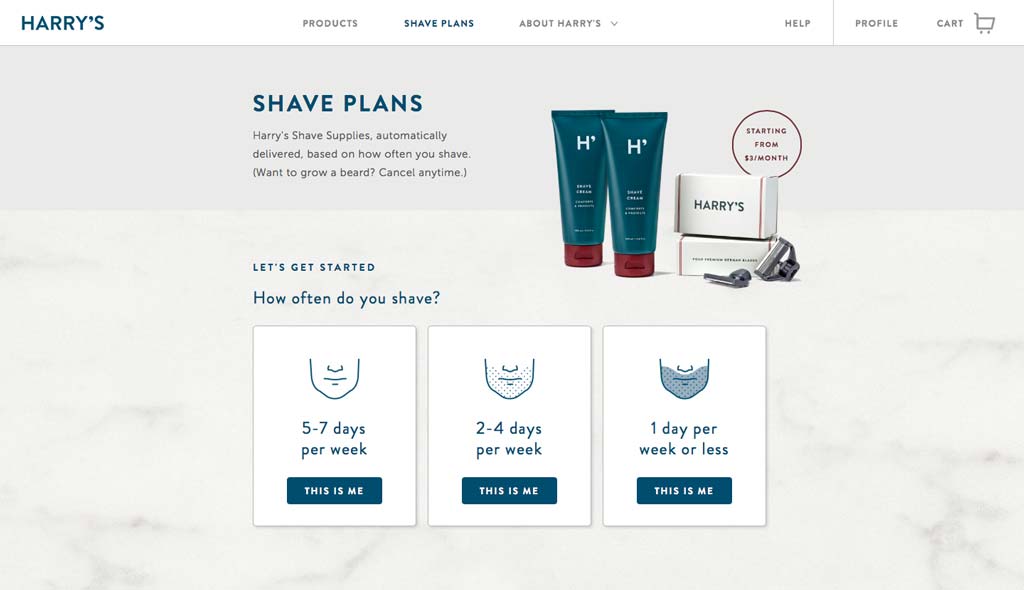 Update: During the process of writing this (at the last minute no less!), Harry’s have changed the design of this page and seemed to simplify it even further. It now no longer has the create your own option but only offers choice based on frequency instead.