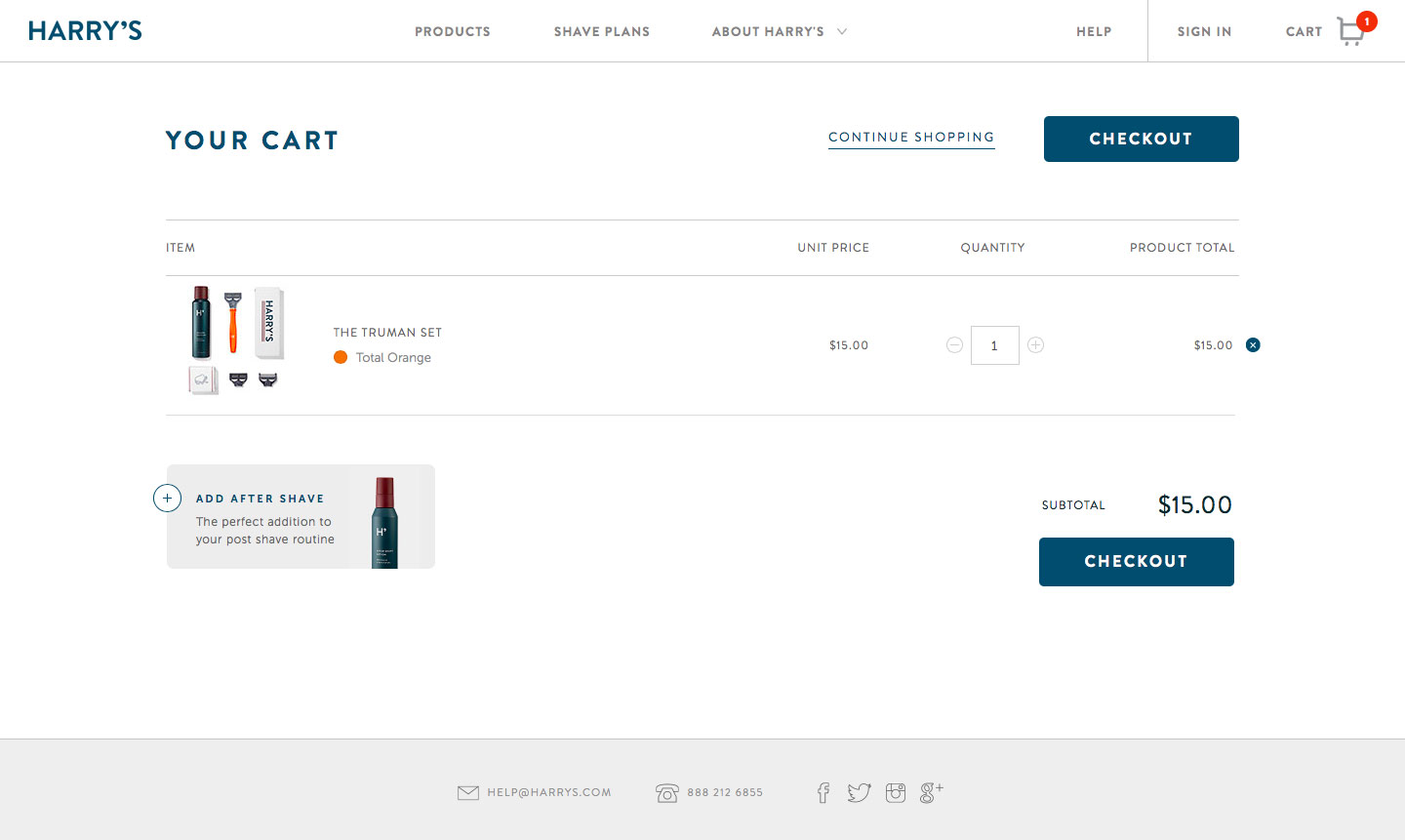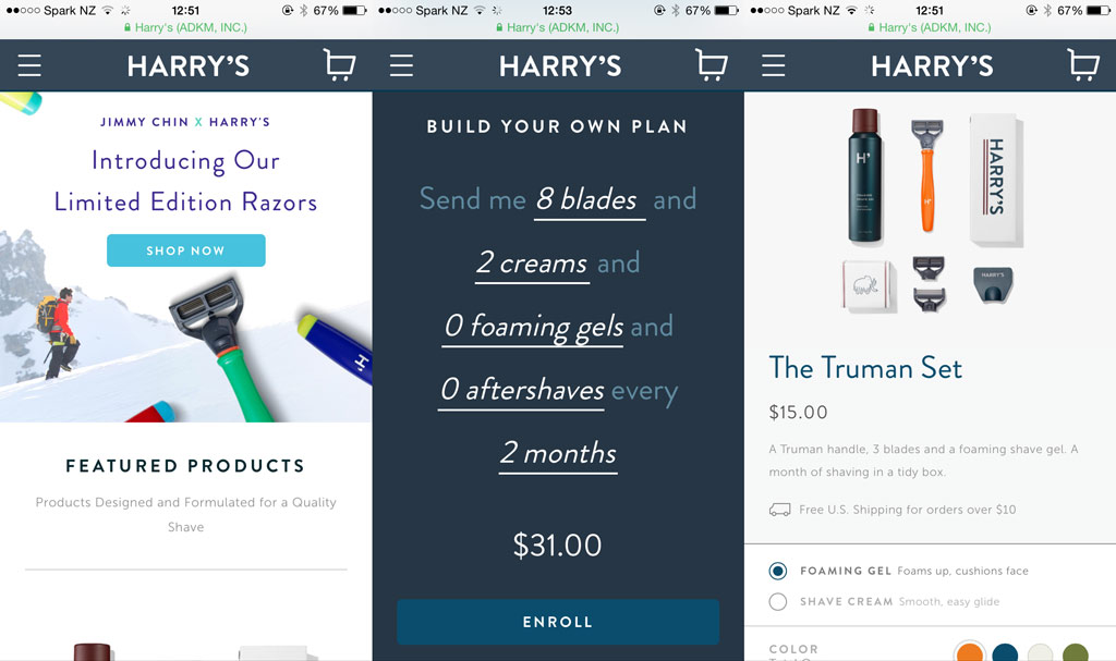 Strangely, Harry’s website isn’t responsive. You would think this is the ideal design to make responsive, as anyone with any experience of responsive design can imagine how they would easily turn it into a responsive site. I’m sure you’re doing that right now.